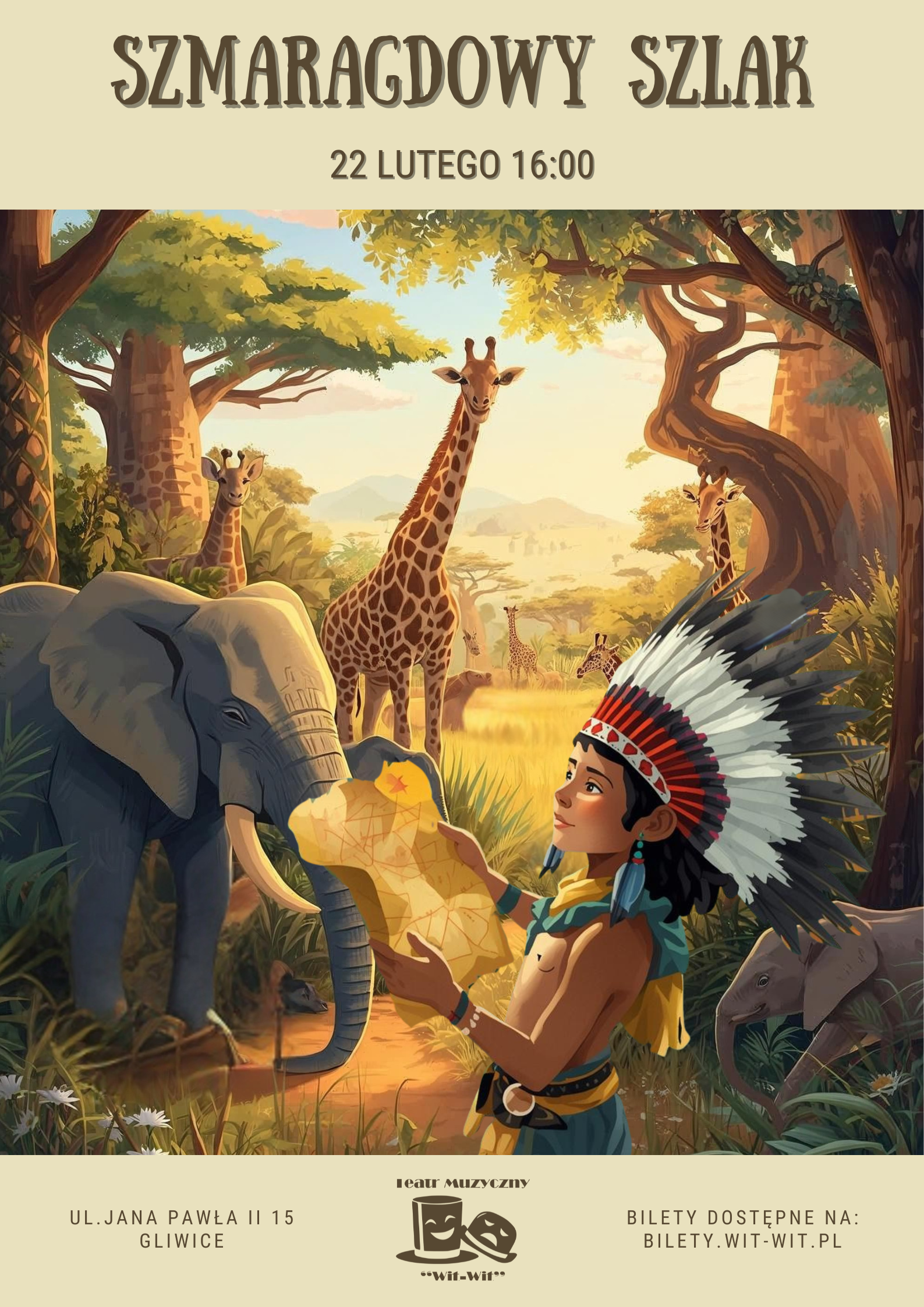 "Szmaragdowy Szlak" to niesamowita historia rozgrywająca się w afrykańskim buszu. Podczas sztormu piracki statek rozbija się u wybrzeży Afryki. Fale wyrzucają na brzeg rozbitków - Indiankę, Indianina i Kowboja. W ich rękach znajduje się tajemnicza stara mapa, na której wyrysowany jest Szmaragdowy Szlak. Bohaterowie wyruszają na poszukiwania ukrytego w sercu Afryki skarbu- Trzy Wody. Wędrując przez dżunglę przeżyją wiele niebezpiecznych przygód. Spotykają na swojej drodze egzotyczne afrykańskie zwierzęta - jedne pomocne i przyjazne, inne złe i podstępne. Czy uda im się pokonać Szmaragdowy Szlak? Czy dojdą do celu? I co kryje się za tajemniczą nazwą Trzy Wody? "Szmaragdowy Szlak" to bajka muzyczna, pełna humoru, muzyki i tańca.