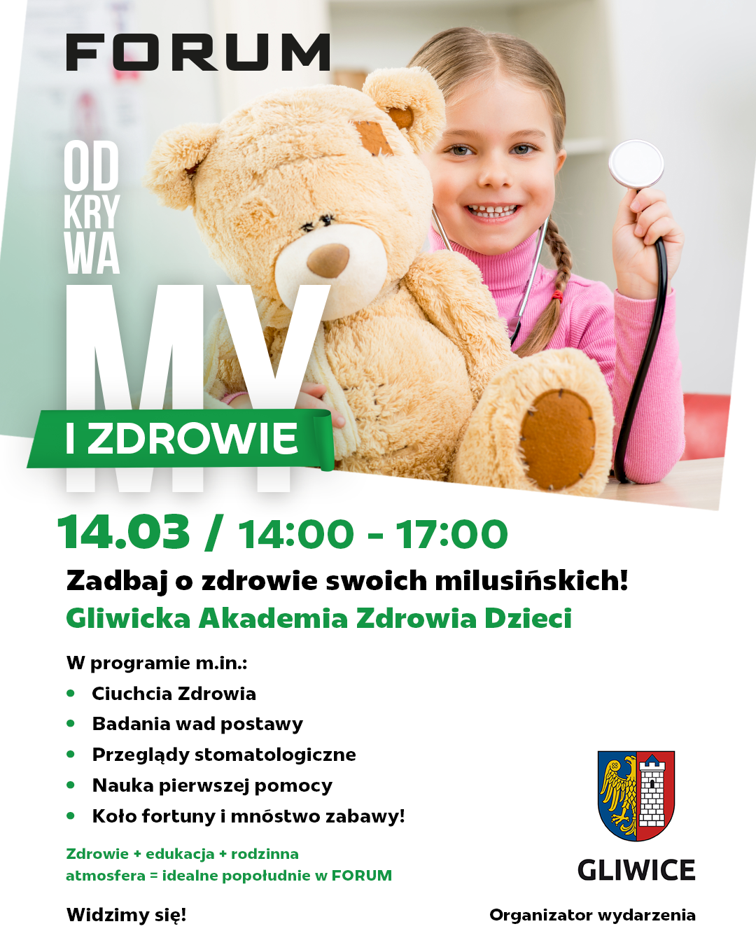 W sobotę 14 marca, w godz. 14:00-17:00, w CH FORUM w Gliwicach odbędzie się kolejna edycja wydarzenia pod hasłem Gliwicka Akademia Zdrowia Dzieci, znanego mieszkańcom również jako popularna „Ciuchcia Zdrowia”. To już ósma odsłona rodzinnej imprezy promującej zdrowy styl życia i profilaktykę zdrowotną wśród najmłodszych.